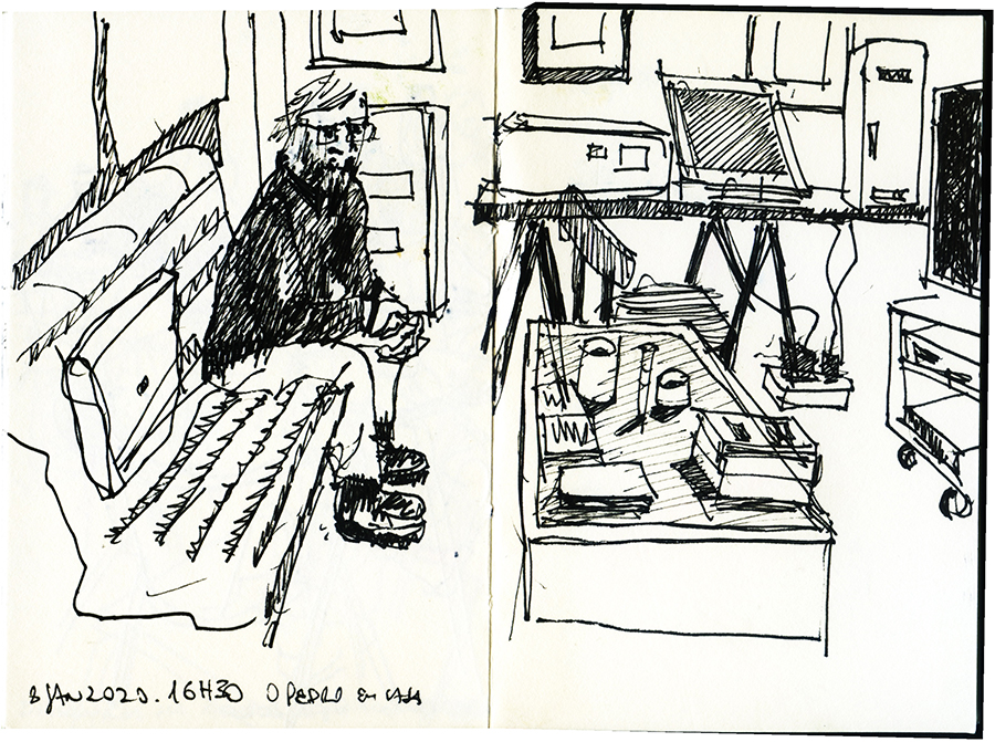 O livro “Caderno de Retratos-Memórias Imperfeitas” (capa e contracapa em baixo) consta de 93 retratos de amigos meus que me visitaram nos meses de Julho, Agosto e Setembro. Tem também desenhos daqueles que me têm acompanhado há muitos anos nesta aventura de desenhar em cadernos, os Diários Gráficos: Pedro Cabral, Filipe Leal Faria, José Louro, Lapin, Teresa Ruivo e João Catarino. Estes dois últimos também com um texto. E ainda um texto da Joana Francisco, a editora, e a impulsionadora deste projecto.