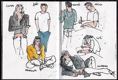 Aproveitei o facto dos meus alunos estarem a posar uns para os outros para os desenhar a todos. Alguns até estão repetidos. É curioso como o formato do caderno condiciona o que desenhamos. Desde que comecei este só me apetece desenhar pessoas.