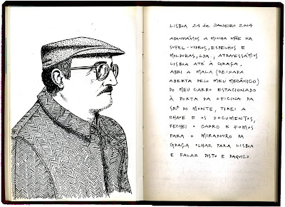 Amanhã é a última sessão do workshop: “Diário Gráfico. Instrumento criativo da escrita e do desenho”. Vamos fazer um balanço das actividades. Vamos a ver se o objectivo principal foi atingido – tornarmo-nos uns desenhadores compulsivos, apanharmos o vício de observar as coisas, as pessoas, os lugares e registar por meio do desenho, da escrita ou doutra maneira qualquer, uma impressão.