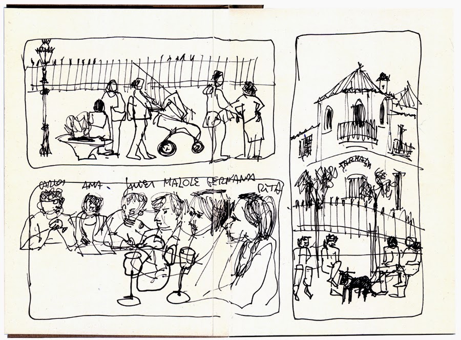 Neste desenho chamou-me a atenção a senhora que estava a fumar com uma pose teatral. Comecei pela mão dela quando estava com o cigarro na boca. Quis apanhar esse gesto.