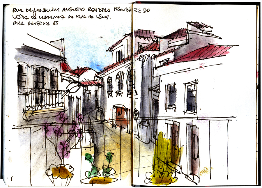 São João da Pesqueira é uma pequena cidade que, como tantas outras, se desenvolveu abandonando o Centro Histórico. Neste poucas pessoas vivem e o comércio é escasso. E é pena porque os edifícios estão bem recuperados e a Praça da República é muito bonita. Fiquei numa casa da rua Direita. O primeiro desenho é feito a partir da varanda para a rua traseira. Os outros dois são da dita praça.