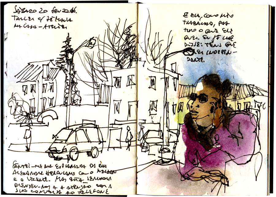 Neste blog só publico, quase exclusivamente, desenhos feitos em cadernos – o chamado Diário Gráfico ou de Viagem. São desenhos meus ou de outros autores. Esta prática, de desenhar em cadernos, trouxe outro tipo de actividades, que eu achei importante trazê-las também para este blog (ver botões em cima): Textos (alguns) meus publicados sobre este tipo de desenho; Oficinas e/ou conferencias (uma selecção) onde não ensino a desenhar mas incentivo as pessoas a fazê-lo; Exposições de cadernos, individuais ou com vários autores, que organizei e onde participo; Viagens (algumas), que são o espaço próprio para este tipo de desenho. E ainda os Livros, os que tenho em casa, mas só aqueles, de um só autor e que simulam um próprio Diário de Viagem ou de vários autores e que mostram páginas integrais de cadernos. Ainda falta organizar, e criar um botão, das cidades onde desenhei.