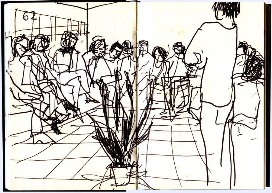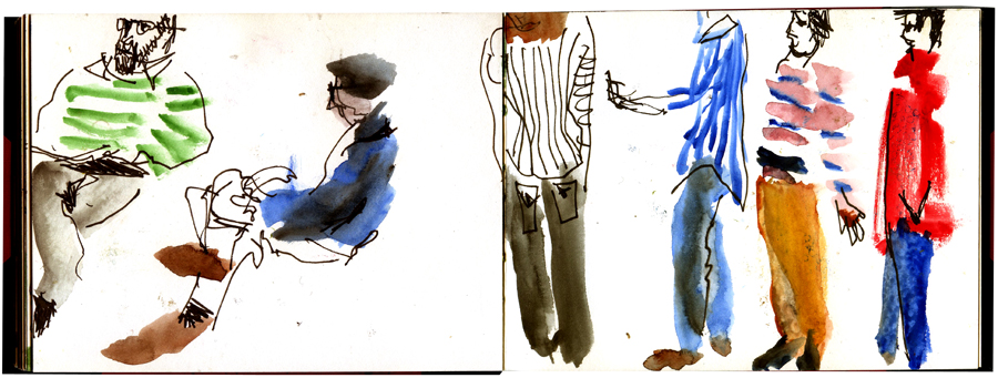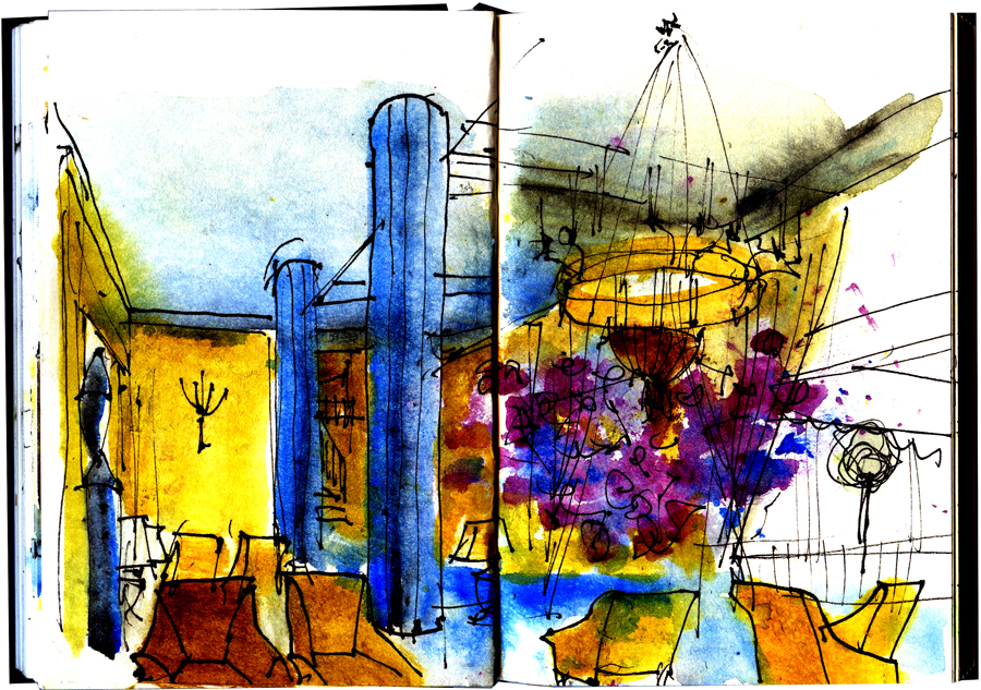 Era muita informação. Resolvi sentar-me em 3 sítios diferentes e desenhá-los. Como se não houvesse pessoas. Ficou um pouco confuso. Tentei com a cor definir melhor os espaços.