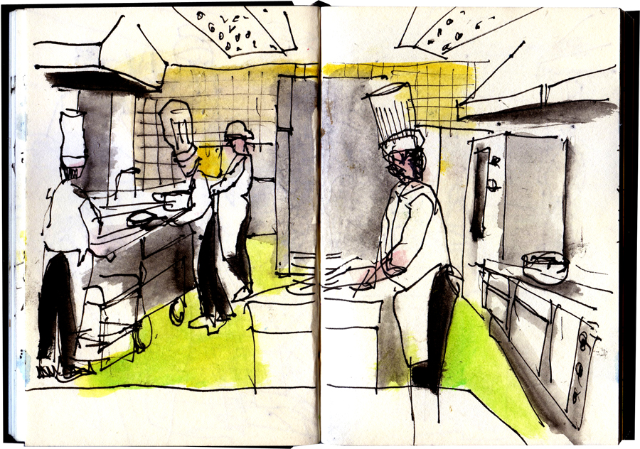 As cozinhas são lugares de muito movimento e de pessoas muito atarefadas. Os cozinheiros não paravam. As suas acções não se repetiam. Havia ali uma espécie de dança mas onde os passos não se repetiam. E isso tornou tudo mais difícil.