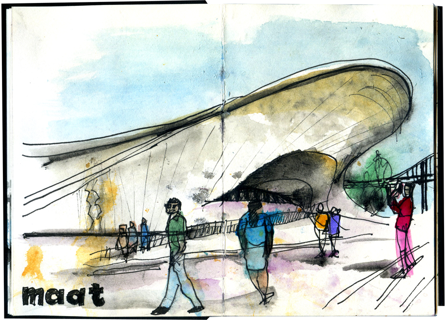 Uma espécie de reportagem para o jornal Público, suplemento P2 do passado domingo, sobre o MAAT (Museu de Arte, Arquitectura e Tecnologia). No jornal saiu o primeiro desenho (aqui a dupla página). Fiz vários, alguns dos quais estão em baixo. A sair todas as semanas sob o título "Semana ilustrada".