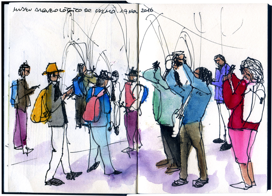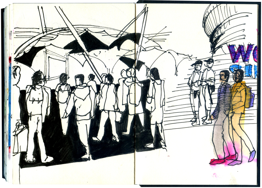 Tenho feito ultimamente mais desenhos no metro. Não porque ande mais de metro mas porque é um verdadeiro desafio. Muitas pessoas juntas num pequeno espaço cria grandes dificuldades. Pessoas mesmo à nossa frente ou ao nosso lado podem ver o que estamos a fazer. E no metro de Lisboa há dificuldades acrescidas. Por ser uma rede curta o tempo entre as paragens é menor, estando sempre pessoas a entrar e a sair.