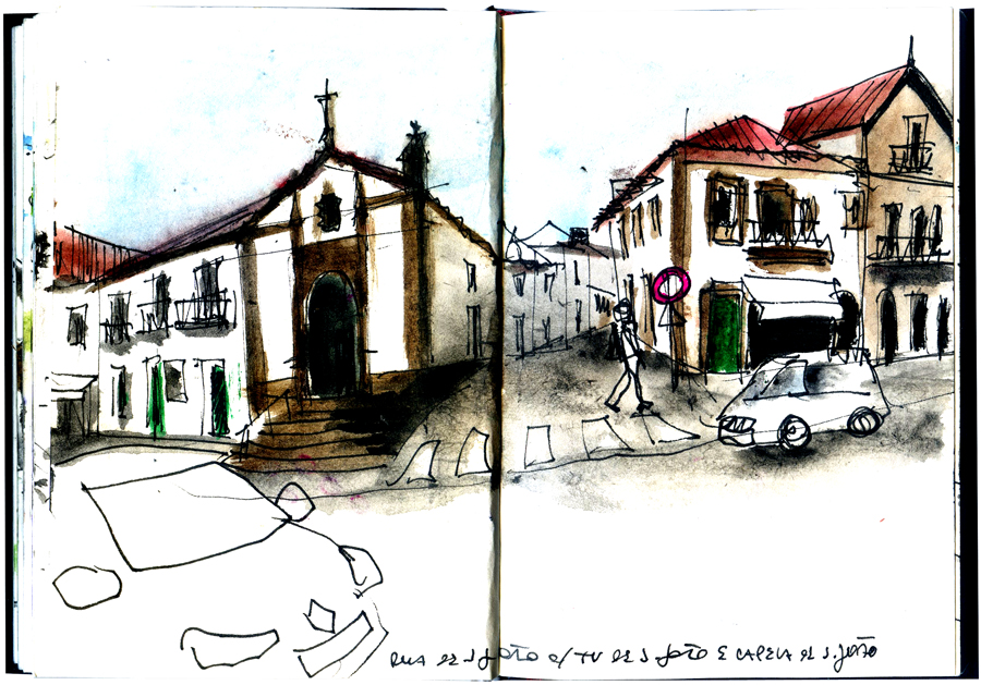 Desenhei o largo do Chafariz quando estava a chuviscar. Saí depois pela rua de S.João. Havia poucas pessoas na rua.
