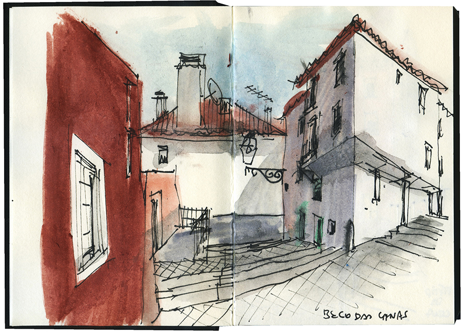 Viana do Castelo vista do navio Gil Eanes, com Santa Luzia ao fundo, depois já cá em baixo, com o navio à esquerda, subindo a av. Combatentes da Grande Guerra com os seus edifícios Arte Deco, virando à direita até à rua da Bandeira e o último desenho na rua Espírito Santo.