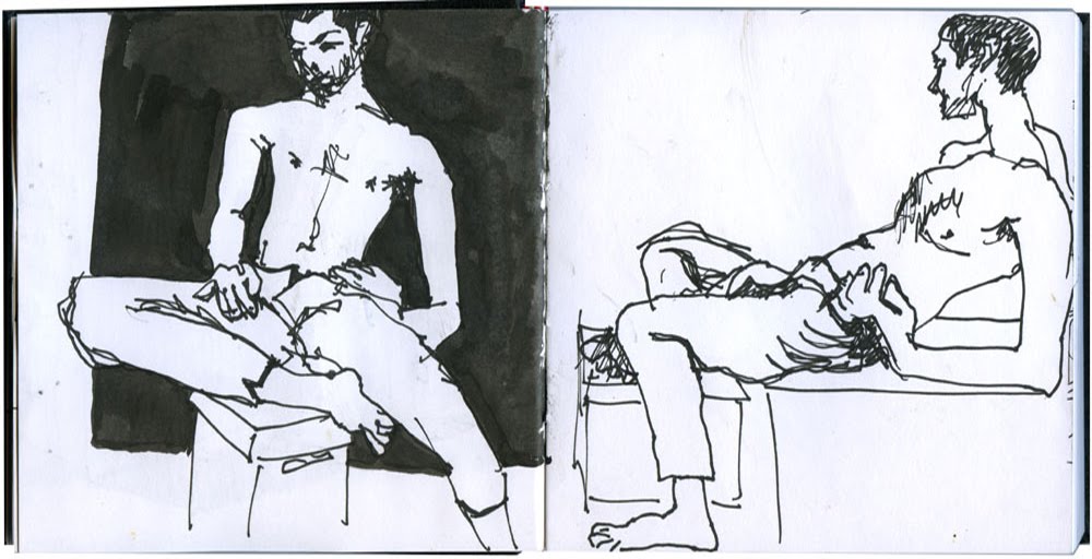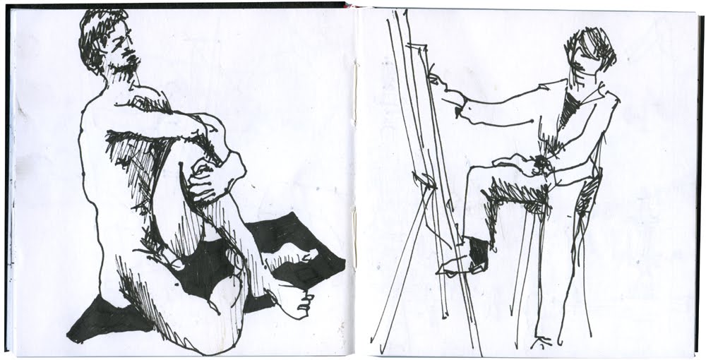O desenho feito em cadernos apoderou-se de mim (nem sempre é bom ser-se apoderado por alguma coisa). Para fugir a isso tenho feito algum desenho de modelo em folhas A3. São poses de 10 minutos. Quando sobra tempo vou ainda rabiscar no caderno. É o vício.