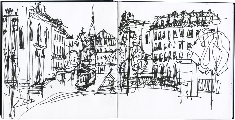 Sentei-me nas escadas da estátua pronto para desenhar tudo à volta, mas o meu vizinho do lado, que entretanto apareceu, não parava calado. Fiquei-me pelo registo, muito rápido, do que estava em frente.