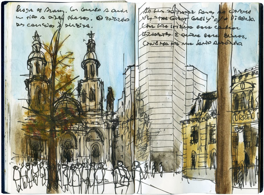 A Praças de Armas nas cidades latino-americanas, excluindo o Brasil, são sempre os centros principais. Onde estão todos os centros de poder: político, religioso, judicial. E também onde as pessoas se encontram e onde acontece tudo. Mas a de Santiago do Chile supera todas. Não é a mais bonita mas é a mais diversificada: jogadores de xadrez, pintores, leitores de tarot, manifestações políticas, vendedores da bíblia, palhaços, marionetas, macacos amestrados. E a própria arquitetura é diversa: a catedral neoclássica dialoga com o centro comercial em vidro.
