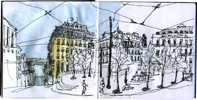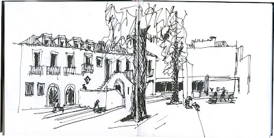 No regresso a Lisboa ainda passámos por Évora, onde comemos uns saborosos caracóis (pena, mas não os desenhei), sentados numa esplanada neste agradável largo. O largo Álvaro Velho.