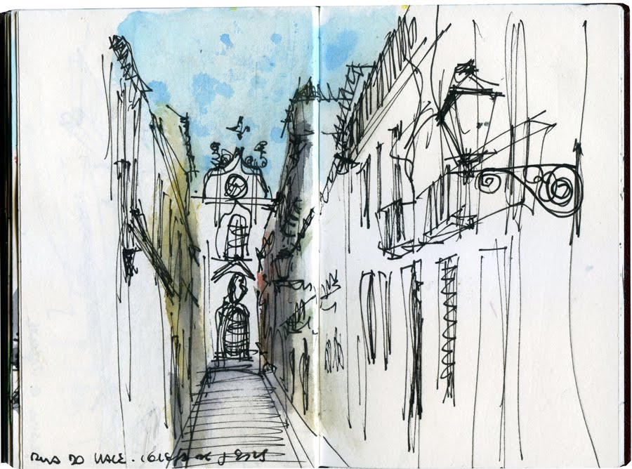 O Pátio da Inquisição, em Coimbra, tem uma dimensão muito simpática para desenhar. Fi-lo de dois lados opostos. Primeiro (desenho de baixo) em pé, para ser rápido, e o segundo (desenho de cima) já sentado numa pequena esplanada.