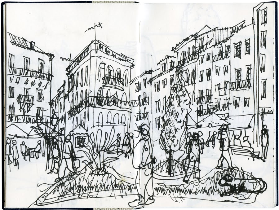 Sentámo-nos na esplanada do Café Nicola. Enquanto eles se preocupavam em registar só os volumes com o claro-escuro, eu podia fazer o que quisesse. Depois descemos as escadas junto à igreja de S.Tiago e fizemos o mesmo na praça.