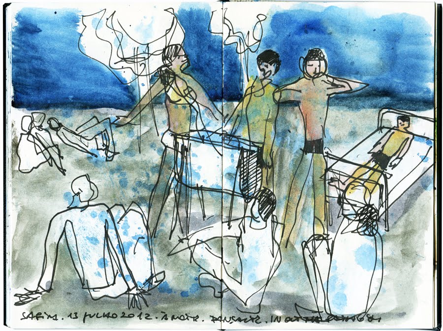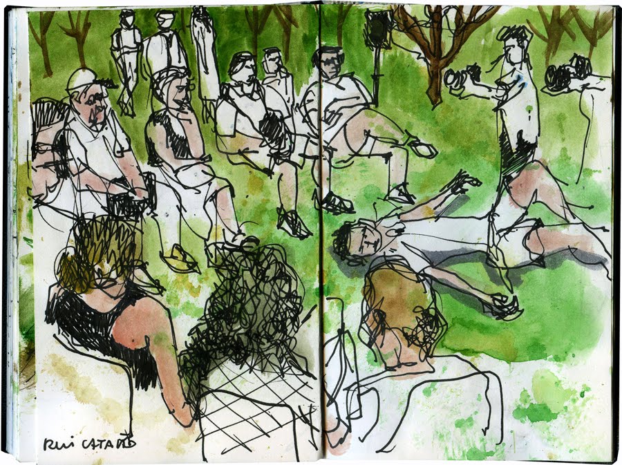 No P2, suplemento de Domingo do jornal Público, Alexandra Prado Coelho escreve, na sua crónica urbana, sobre a Feira do Relógio. Os desenhos são meus. E desenhar com um calor abrasador não é agradável.