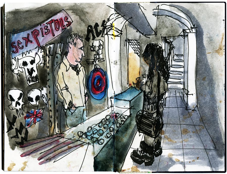 Pedro, o dono da loja punk "Silver Stone" na rua da Prata, e uma cliente punk, claro. A mesma loja a que já me tinha referido aqui.