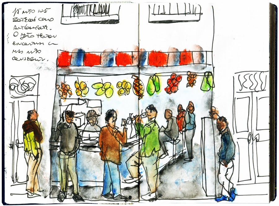 Há a tendência para os Diários Gráficos serem o suporte onde fazemos desenhos para mostrar aos outros como somos bons desenhadores. Talvez sejam os blogues os “responsáveis” por isso. “Vejam como desenhei tão bem isto” parecemos dizer quando “postamos”. Ora isto é o contrário, para mim, do que deve ser um Diário Gráfico: espaço de liberdade onde a ideia de erro não faz sentido. Veio-me isto à cabeça, ontem, quando estava a ouvir a Dilar no seu excelente trabalho de mestrado na FBAUL.