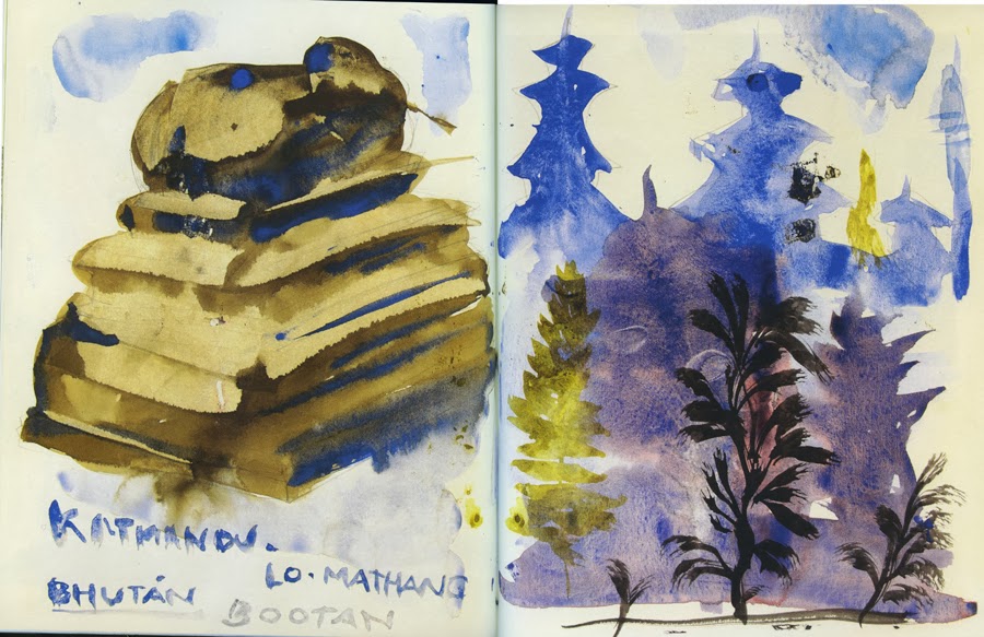 Em 2009 e 2010 Miquel Barceló andou pelo norte da Índia. Levou dois cadernos. Um pequeno com linhas onde escreveu muito e desenhou pouco. Outro, maior, onde só desenhou a pincel e com aguarela.